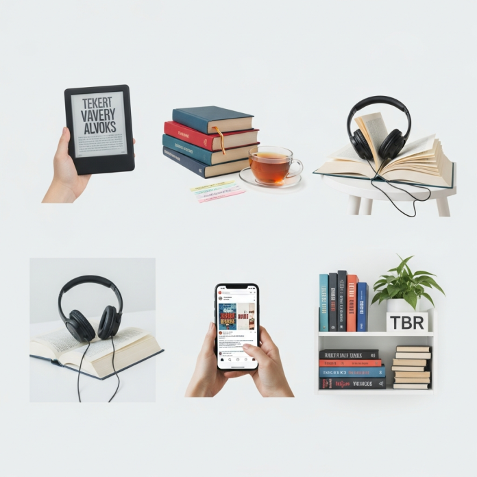 Person listening to an audiobook on a smartphone, with e-reader and physical books in the background, illustrating Book Lovers Trends.
